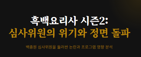 - 활동 중단 선언의 번복?: 일련의 사태 이후 백종원은 방송 활동 중단 의사를 밝히고 경영에 집중하겠다고 선언했으나, <흑백요리사2>는 논란 이전에 이미 촬영이 진행된 프로젝트였습니다. 제작진은 100여 명의 출연진이 얽힌 대형 프로젝트인 만큼 "하차나 편집 없이 정상 공개"한다는 정면 돌파를 선택했습니다.