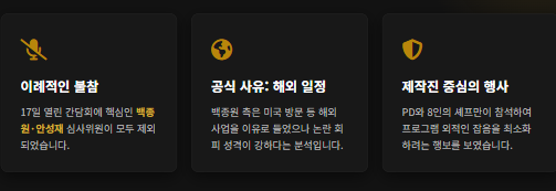 | 작품 밖 상황 | 공식 홍보 행사에 불참하며 프로그램 외적인 논란이 작품에 끼칠 영향을 최소화하려는 조심스러운 행보를 보임 |