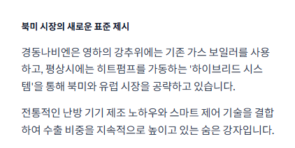 전통적인 가스보일러 시장은 정체기에 접어들었지만, 경동나비엔은 북미와 유럽 시장을 타겟으로 히트펌프와 가스보일러를 결합한 하이브리드 제품을 선보이며 활로를 찾았습니다.
