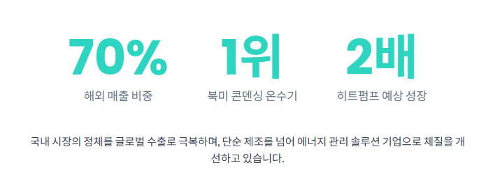 영하의 강추위에는 보일러를 돌리고, 평상시에는 효율 좋은 히트펌프로 난방을 하는 식이죠. 북미 시장에서의 탄탄한 인지도를 바탕으로 히트펌프 수출 비중을 계속 높여가고 있어 성장이 기대되는 종목입니다.