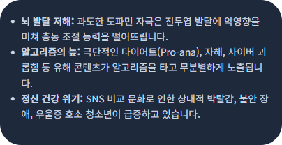 • 청소년의 뇌 발달 단계에서 SNS에 과도하게 노출될 경우 도파민 중독 현상을 일으켜 학습 능력 저하, 우울감, 불안 장애 등 심각한 정신 건강 문제를 유발한다는 연구 결과가 증가하고 있습니다.