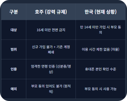 • 호주 등 해외 사례: 호주 등 일부 국가는 16세 미만 청소년에 대해 페이스북, 인스타그램, 틱톡 등 주요 SNS의 신규 계정 생성은 물론 기존 계정 사용까지 전면 금지했습니다.