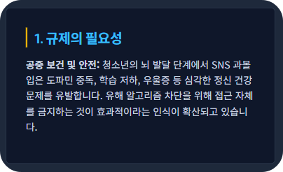 • 특히 SNS 알고리즘이 유해한 콘텐츠(극단적인 다이어트, 자해 관련 내용, 사이버 괴롭힘)를 청소년에게 노출시키는 위험을 원천적으로 차단하기 위해 접근 자체를 금지하는 것이 가장 효과적인 해결 방법이라는 인식이 커지고 있습니다.