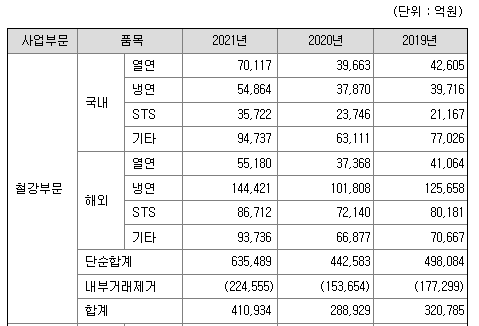 회사는 사업의 성격에 따라 4개의 부문(철강, 무역, 건설, 기타)이 있으며, 연결대상 회사는 총 170개사이다. 철강부문의 연결대상 회사는 포스코, 포스코강판(주)국내 2개사를 비롯하여 중국 POSCO (Zhangjiagang) Stainless Steel Co., Ltd., 해외 가공센터 등 해외 60개사를 포함하여 총 62개사입니다. 포스코는 열연, 냉연, 스테인리스 등 철강재를 포항제철소와 광양제철소에서 생산하고 있다. 포스코강판은 표면처리강판 제조전문기업이며, 스테인리스 강판 제조/판매사인 중국 POSCO (Zhangjiagang) Stainless Steel Co., Ltd. 과 철강재 가공/판매하는 해외 가공센터 등이 있습니다. 세계 조강생산량은 중국의 지속적인 경기부양 정책 실시로 '17년 이후 매년 증가해왔으나 COVID-19 발발로 인하여 '20년에 일부 감소하였다. 그러나 각국의 회복 노력으로 '21년 누계 글로벌 조강생산량은 전년비 3.7% 증가한 1,951백만톤이었으며, 우리나라 역시 전년비 5.2% 증가한 71백만톤을 기록하였다.