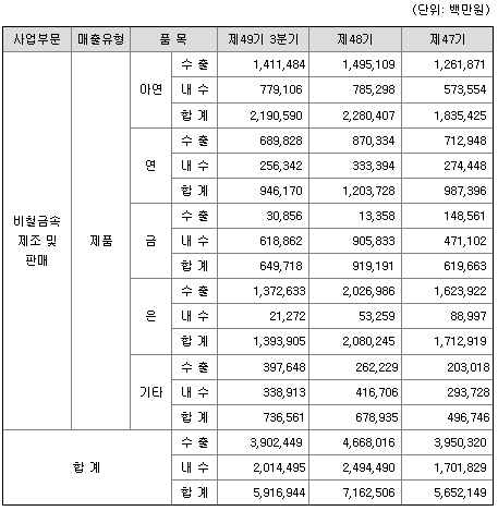 고려아연은 비철금속제련회사이다 아연과 연의 생산판매를 주로 관리하며 영업을 하고있으며 이 사업은 한국표준산업분류표의 소분류와 같고, 금, 은, 황산 등은 아연과 연제련과정에서 걷어들이느느 유가 금속과 부산물의 종료로 생산하고 있다. 2010년 이후에 도입한 K-IFRS 기준에 의하면 연결대상에 포함된 기업들이 영위하는 사업으로는 비철금속 제조 및 판매업 (Sun Metals Holdings Ltd, Sun Metals Corporation Pty., Ltd., 스틸사이클(주), Zinc Oxide Corporation Vietnam Limited Liability Company), 비철금속 수, 출입업(서린상사(주)), 광산개발 및 정광수출업(Pan-Pacific Metal Mining Corp., KZ Minerals Holdings PTE Ltd, ICM Pachapaqui S.A.C.) ) 등이 있다. 그외에 2차전지 소재인 동박을 만드는 게이잼, 중장비 임대업, 케이지엑스 등이 있다.