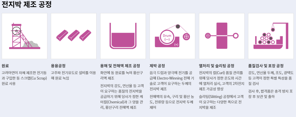 전기차 배터리의 4대 소재중 하나가 음극 소재다. 전지박은 이 음극을 지지하는 극판소재다. 국제에너지기구(IEA)는 2030년까지 전 세계 전기차 보급 대수가 연간 30% 성장해 누적 1억4,500만대에 달할 것으로 보인다. 이에 따라 전기차용 배터리의 핵심소재인 동박 수요 역시 가파르게 증가할 것으로 예상된다. 최근 SNE Research는 2027년 전 세계 동박수요가 1,164천 톤에 이를 것으로 보인다. 고려아연은 2020년 3월 100%를 출자하여 전지박 생산과 판매를 담당할 자회사 케이잼을 설립했다. 고려아연 울산 온산제련소 부근에 위치하고 있으며, 연간 1만 3000톤 규모의 전지박 공장을 2022년 말 완공, 2023년부터 양산에 돌입할 예정이다. 또한, 케이잼은 연간 1만 3,000톤의 생산량을 6만 톤으로 늘릴 수 있도록 공장을 증설할 계획이다. 이를 위해 현재 공장부지 외에 고려아연이 소유한 부지를 추가로 확보, 2025년 까지 1차 증설(3만 톤)을 완료하고, 2027년 까지 2차 증설(6만 톤)을 마무리한다는 계획이다. 글로벌 NO.1 제련기술이 만드는 동박. 고려아연의 독보적 기술력인 용해, 전해기술을 활용해 독보적이고 안정적인 2차 전지용 전지박이 만들어진다. 고려아연은 기존 비철금속제련 산업에서의 독자적인 기술력과 노하우를 바탕으로, 유사한 공법의 동박 분야에서도 기술적 우위를 가져갈 수 있을 것이라 평가받는다. 또한 이런 기술력은 월등한 품질과 원가 경쟁력을 이끌어 낼 것이라 예상된다.