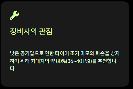 • 주행 시 공기압 상승: 주행을 시작하면 타이어와 노면의 마찰로 인해 온도가 올라가고, 타이어 내부 공기가 팽창하면서 공기압은 자연스럽게 3~6 PSI까지 높아집니다.