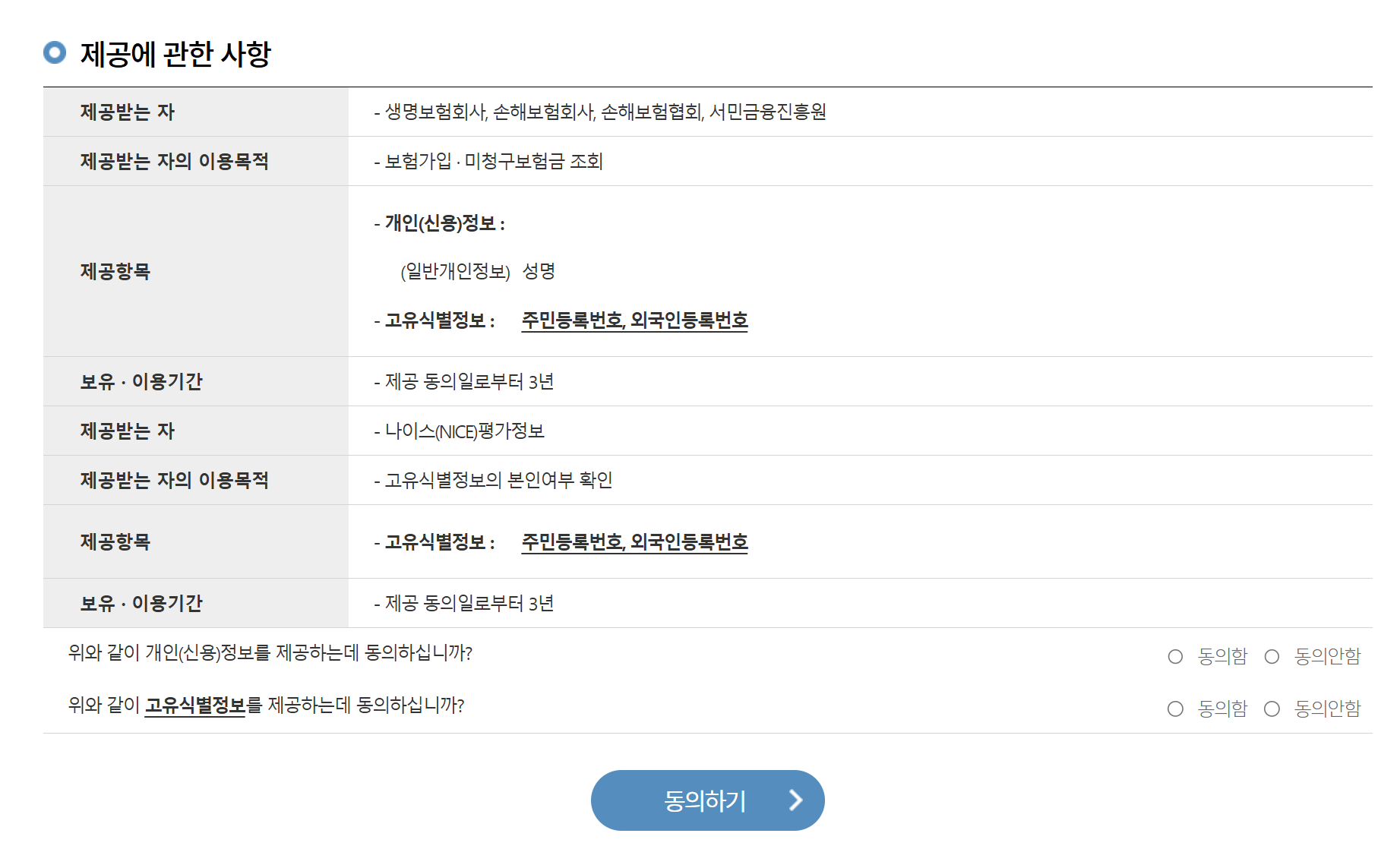 개인정보 이용에 동의하고, 조회를 시작하면 내가 가입한 모든 보험이 표시됩니다.