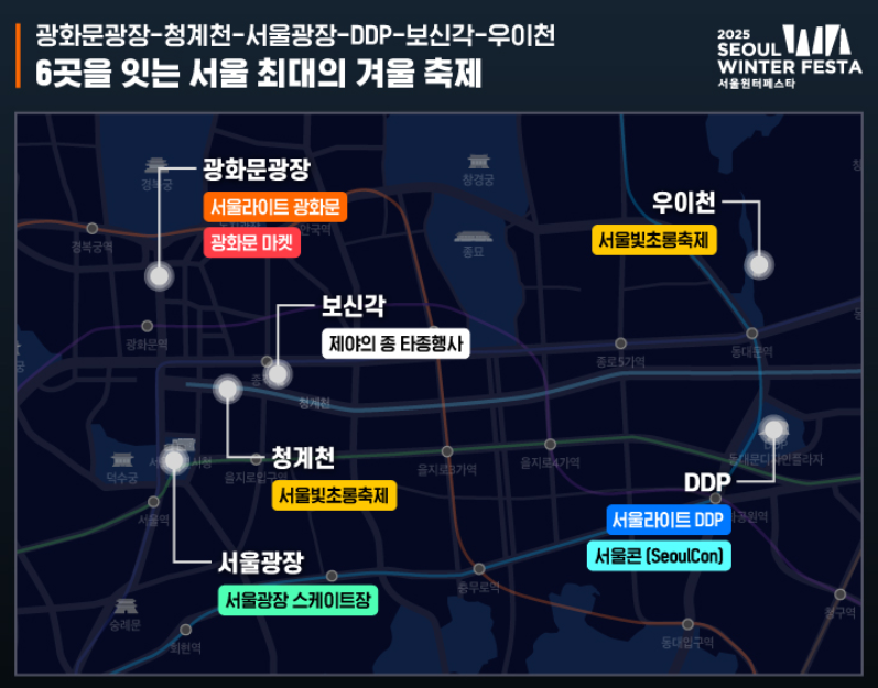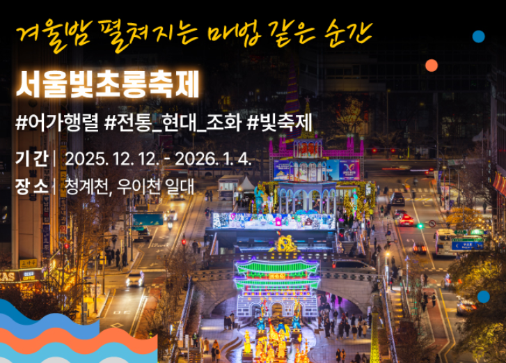 - 축제 기간: 개막일인 12월 12일부터 새해를 지나 2026년 1월 4일(일)까지 약 3주간 주요 프로그램이 운영됩니다. 이는 관광객들이 크리스마스와 연말연시를 서울에서 보낼 수 있도록 유도하는 전략적인 기간 설정입니다.