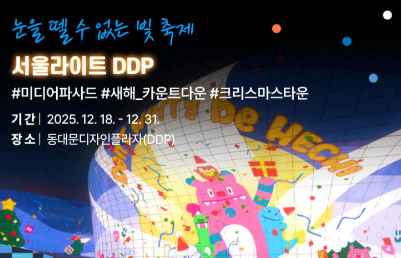 - 서울라이트 DDP: DDP 외벽에서도 별도의 미디어파사드 전시가 12월 18일부터 시작됩니다. DDP 인근을 방문한다면 놓치지 말고 관람해야 합니다.