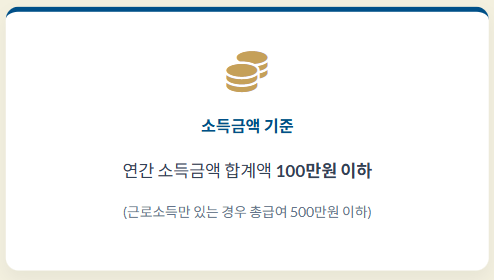 - 연간 소득금액 합계액: 근로, 사업, 양도, 퇴직소득 등을 모두 합한 금액이 1백만 원을 초과하면 공제 대상에서 제외됩니다.