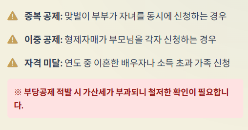 - 맞벌이 부부가 자녀를 중복으로 공제: 이는 부부 각자가 소득이 있어 공제 신청이 가능하다고 오해하기 때문에 자주 발생하지만, 자녀 1명에 대한 기본공제는 부부 중 한 사람만 받을 수 있습니다.