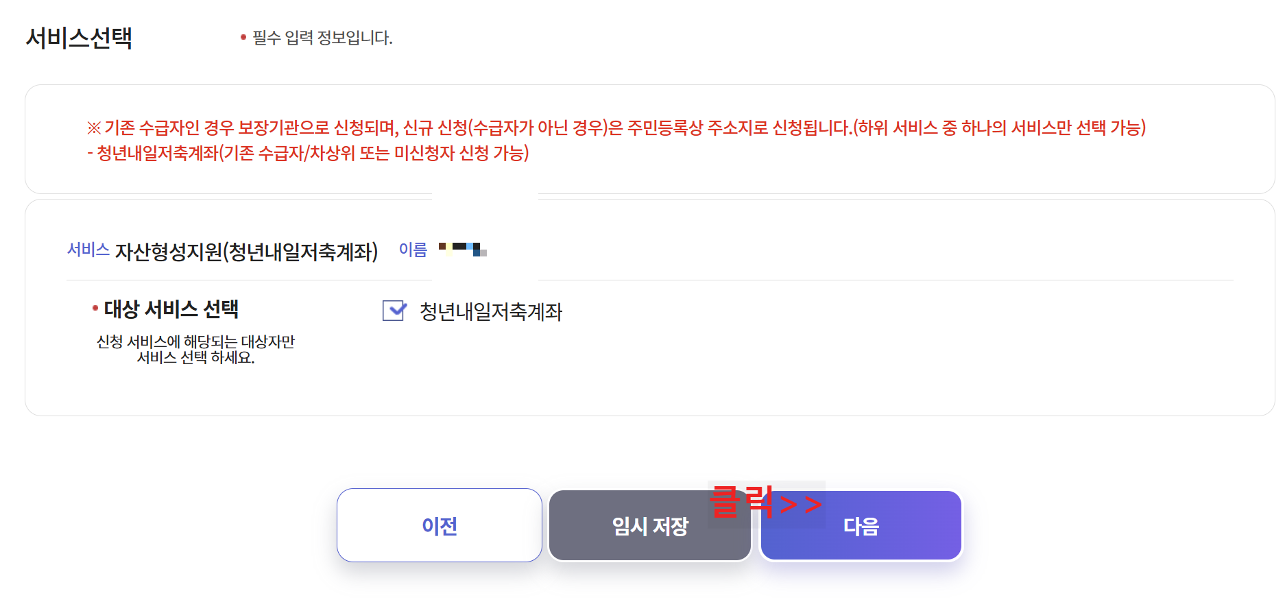 다음 같은 화면이 나오면 밑으로 내려가다보면 청년내일저축계좌가 있습니다. 체크하시고 신청하기!!