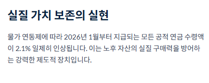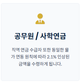 이에 따라 2026년 1월부터 지급되는 모든 공적 연금(국민·기초·군인·공무원·사학연금)은 전년도 물가 변동률인 **2.1%**만큼 일제히 인상됩니다.