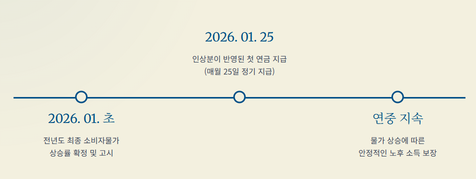 - 연금 지급일: 매달 25일에 지급되며, 2026년 1월 25일에 처음으로 물가 상승분이 반영된 연금액을 확인할 수 있습니다.