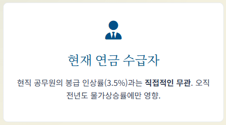 - 현재 연금 수급자: 이미 연금을 받고 있는 분들은 현직 공무원의 봉급 인상률(3.5%)과는 직접적인 관련이 없으며, 오직 전년도 소비자물가상승률에만 영향을 받습니다.