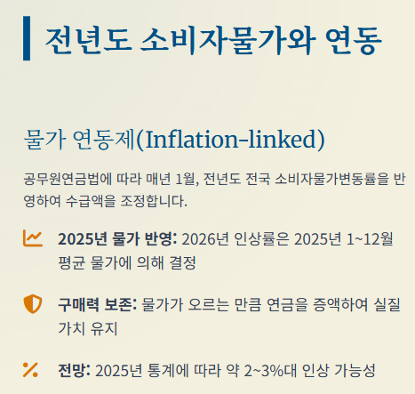 - 물가 연동제: 공무원연금법에 따라 매년 1월, 전년도 전국 소비자물가변동률을 반영하여 연금 수급액을 조정합니다.