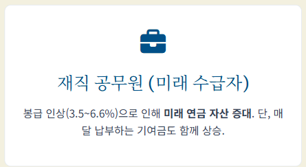 - 재직자라면: 2026년 봉급 인상(3.5~6.6%)으로 인해 미래에 받을 연금 자산이 늘어나는 긍정적인 효과가 있으나, 당장 급여에서 공제되는 연금 기여금도 함께 늘어난다는 점을 인지해야 합니다.