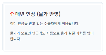 • 원리: 물가 상승으로 돈의 가치가 떨어지는 것을 방어하기 위해, 매년 1월 1일에 전년도 평균 물가상승률만큼 연금액이 조정됩니다.