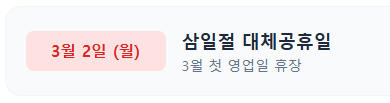 가장 먼저 1월 1일 신정은 휴장하며, 앞서 확인한 대로 1월 2일(금)에 개장합니다. 2월에는 설날 연휴(2월 16일~18일)가 있어 주말을 포함하면 총 5일간 장이 열리지 않습니다. 3월 1일 삼일절은 일요일이므로 다음 날인 3월 2일(월)이 대체공휴일로 지정되어 휴장하게 됩니다.