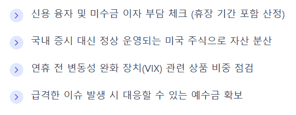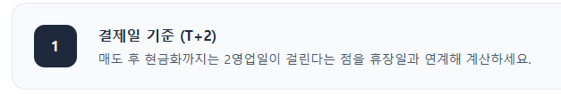 | 연말 휴장일 | 12월 31일(목) (한국거래소 지정 휴장일) | 장이 열리지 않으므로 자금 인출 불가 주의 |