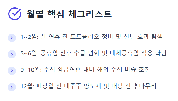 | 연말 폐장일 | 12월 30일(수) 예정 (올해 마지막 거래일) | 당해 연도 최종 수익 실현 및 손실 확정 |