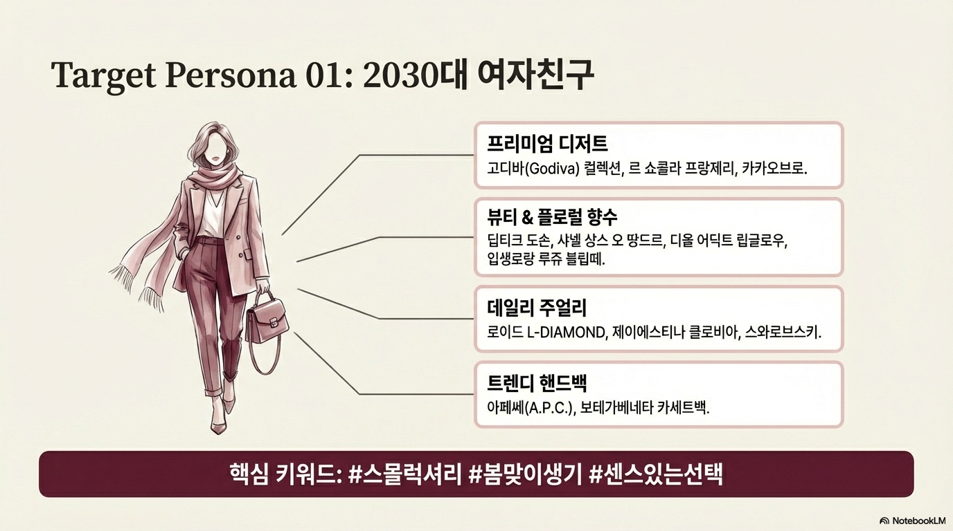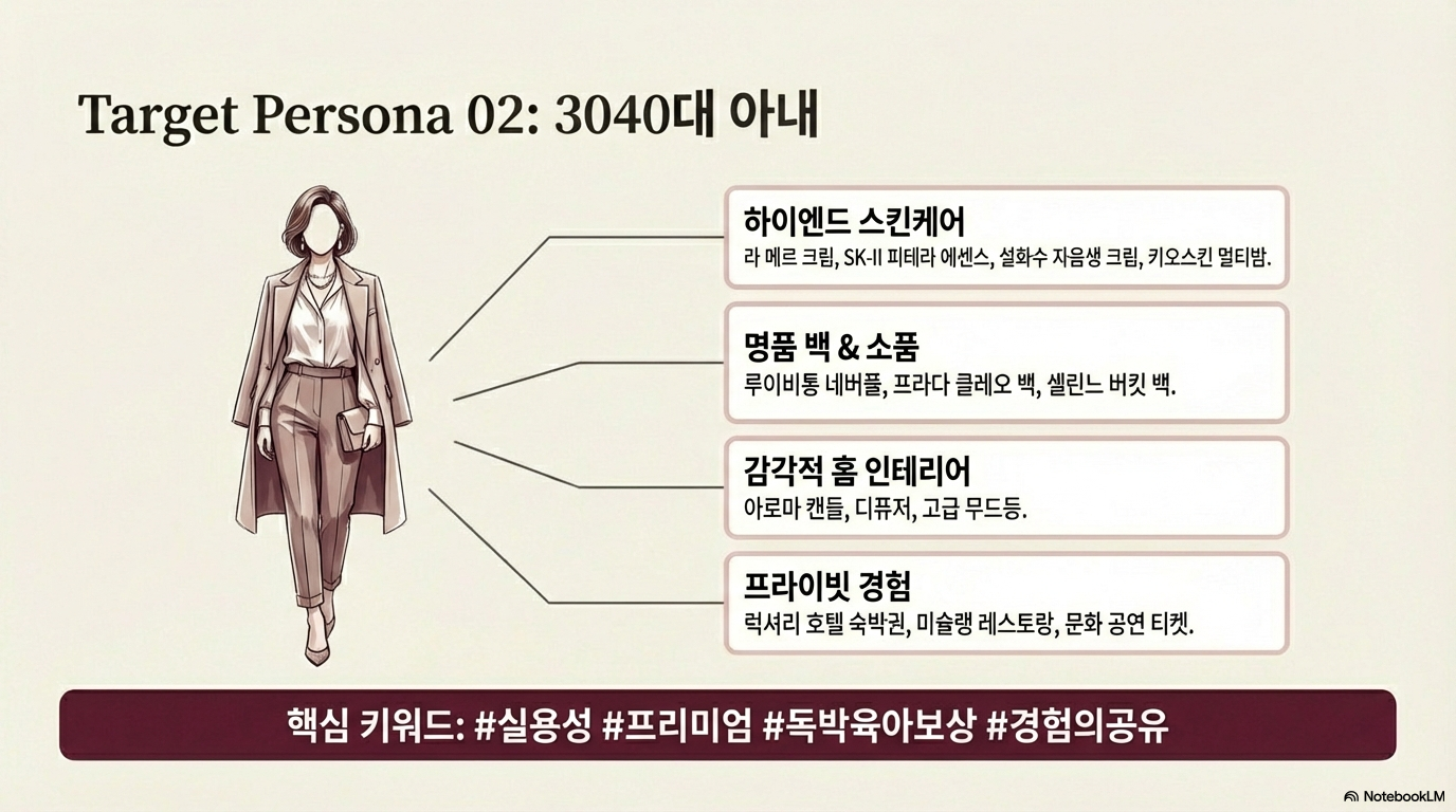 - 하이엔드 스킨케어: 라 메르, 설화수 같은 프리미엄 라인은 단순한 화장품을 넘어 그녀의 '셀프 케어' 시간을 존중한다는 메시지가 됩니다. 또한 클래식한 디자인의 명품 백은 그녀의 프로페셔널한 일상을 돋보이게 합니다.