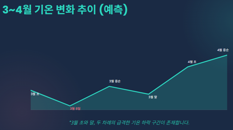 특히 2026년 3월 8일경에는 아침 최저기온이 영하 7도까지 떨어지는 강한 꽃샘추위가 기승을 부리고 있으며, 3월 중순과 하순 사이에도 한두 차례 더 기온이 급격히 하락하는 시기가 있을 것으로 예측됩니다.
