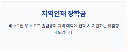 - 지역인재 장학금: 비수도권 고교를 졸업하고 비수도권 대학에 입학한 우수 인재에게 지원됩니다.