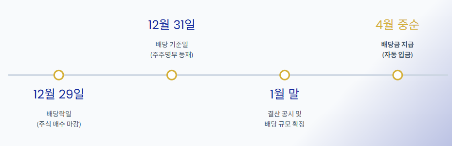 이번 배당금을 받기 위해서는 2025년 12월 말일까지 주식을 보유하여 배당락일(12월 29일) 기준 주주 명부에 등재되어 있어야 합니다. 이미 해당 시점에 주식을 보유하셨던 분들이라면 별도의 신청 없이도 본인의 증권 계좌로 자동 입금됩니다.