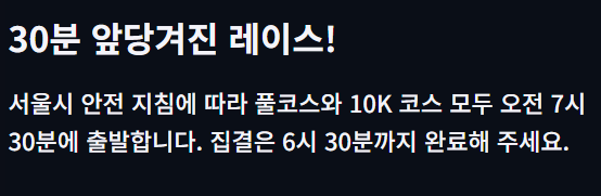 • 출발 시간 변경: 오전 08:00 → 오전 07:30 (풀코스 및 10K 공통 적용)