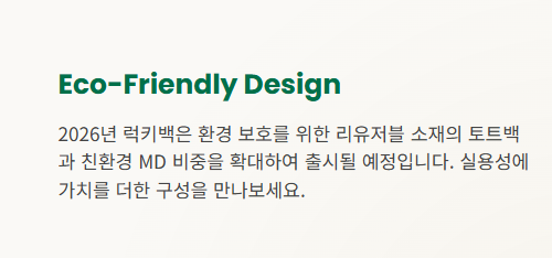럭키백의 가장 큰 매력은 판매 가격을 훨씬 상회하는 풍성한 구성입니다. 2026년 구성품은 환경을 생각하는 지속 가능한 아이템이 주를 이룰 것으로 보입니다.