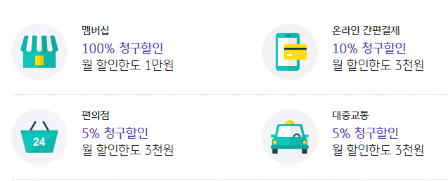 - 대중교통할인 (5% 할인): 버스, 지하철