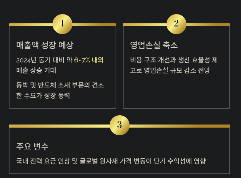- 매출액 성장: 2024년 동기 대비 약 6~7% 내외 매출 상승이 기대되며, 이는 동박 및 반도체 소재 부문의 견조한 수요 덕분입니다.