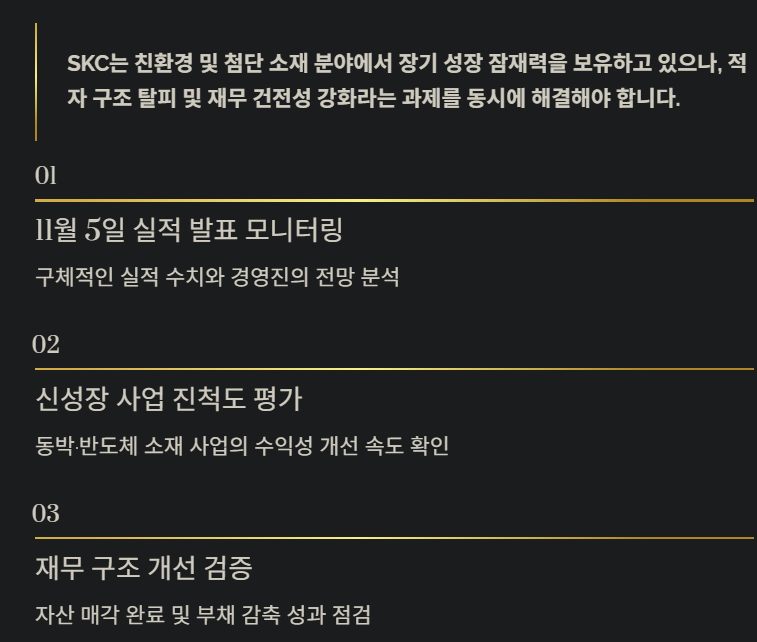 SKC는 친환경 및 신산업 소재 중심의 장기 성장 잠재력을 지니고 있으나, 단기적으로는 영업손실 지속과 재무적 부담이 불가피한 상황입니다. 따라서 투자자는 다음과 같은 포인트를 고려할 필요가 있습니다.