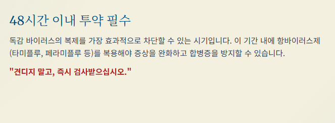 독감 치료의 핵심은 증상 발현 후 48시간 이내에 항바이러스제를 복용하는 것입니다. 이 시기를 놓치면 바이러스 복제를 효과적으로 막기 어려워 합병증 위험이 커집니다.