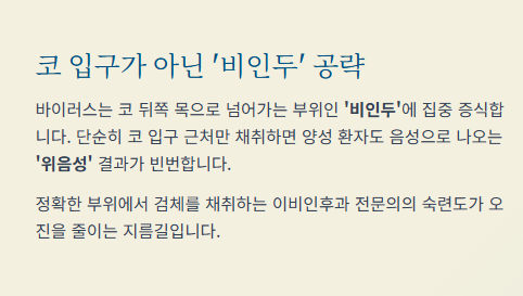 - 검사의 한계: 환자의 저항이나 코피 등 부작용이 두려워 면봉을 코 입구 근처에서만 돌리면 양성 환자도 음성으로 나오는 '위음성' 결과가 빈번합니다. 실제로 타 의원에서 음성 판정을 받고 증상이 심해져 본원을 찾은 환자들 중, 비인두 끝까지 정확히 채취하여 다시 검사했을 때 양성이 나오는 경우가 매우 많습니다.