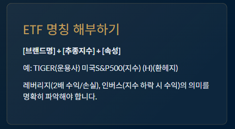 ETF 이름에는 모든 정보가 담겨 있습니다. 예를 들어 'TIGER 미국S&P500'은 미래에셋자산운용(TIGER)이 운용하며, 미국의 S&P500 지수를 추종한다는 뜻입니다. 이름 뒤에 'H'가 붙으면 환헤지(환율 변동 무관), '레버리지'가 붙으면 지수 변동폭의 2배 수익/손실을 의미합니다.
