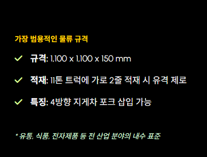 • 용도: 식품, 생활용품, 전자제품 등 전 산업 분야의 일반 화물 적재용.