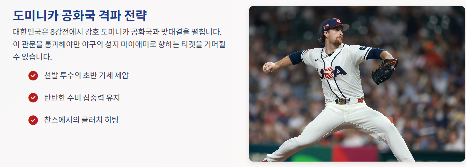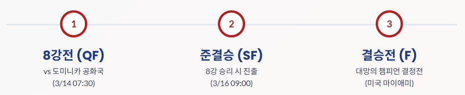 - 8강전 결과 대기: 3월 14일 오전 7시 30분에 열리는 대한민국 vs 도미니카 공화국 경기에서 승리해야 합니다.