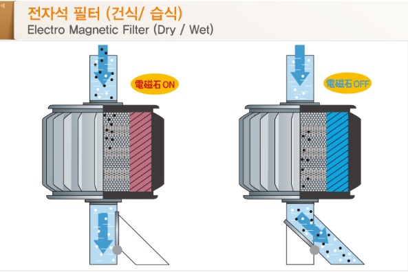 분체 또는 졸 겔형태의 물질을 강력한 자기장 내로, 통과, 투자율이 우수한 강자성체물질 FILTER로 필터링하여 자성체를 제거합니다. 자력을 집중시켜 자력을 극대화 시키는 원리로 원료 내의 미량의 약,강 자성체(철,STS430)을 완벽하게 제거하기 위하여 사용합니다. 자력은 전기에 의하여 제어가 가능하며, 탈철 시 시스템의 구성으로 자동탈철 방식으로도 응용 가능합니다.