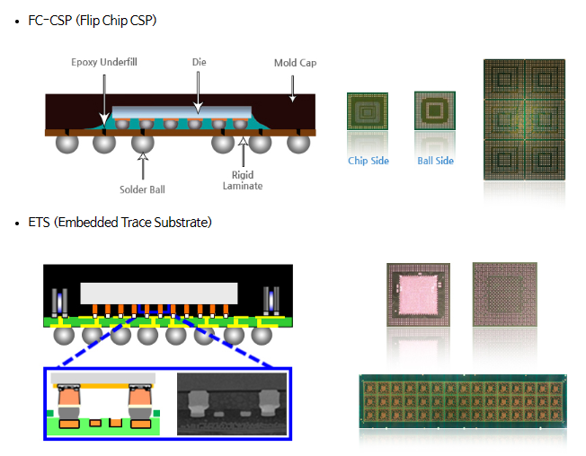 기존의 와이어본딩 대신에 칩의 본딩패드 위치와 동일하게 기판에 범핑패드를 만들어 플립칩 범핑으로 연결한 CSP입니다. 기존의 와이어본딩 방법보다 전기적 특성이 획기적으로 향상되고, 와이어본딩루프 높이가 없어져 좁은 면적으로 칩 실장밀도를 높일 수 있습니다. 플립칩 범프피치 150 µm 이하의 범프형성 및 범프 평탄화(coinning) 기술, 미세회로 형성, 표면처리 등이 주요 핵심기술입니다. - ETS (Embedded Trace Substrate)